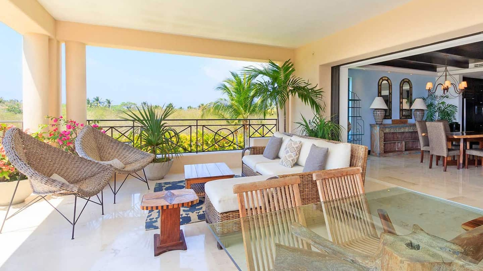 Nestled in the heart of the 5-star Punta Mita gated community, this ocean-view condo ticks all the boxes for families or couples and friends traveling together. Sleeping a maximum of 8 people, you can enjoy all the benefits of Club Punta Mita’s Premier Golf Membership which allows access to all the private beach clubs, access to the Jack Nicklaus golf courses and more.  Besides enjoying stunning ocean views from the condo’s private terrace, renters can bask by the communal pool and jacuzzi that is reserved only for guests staying in your particular building. Located on the third floor, the condo also offers great views from most bedrooms. From the open-plan living and dining spaces to the balcony and gourmet kitchen this spacious vacation condo has beautiful, traditional furnishings and décor to die for!  Imagine this: a warm summer evening, frosty margaritas on the balcony, and dinner at the alfresco dining table. Whether you want a relaxed evening meal or a lively dinner, this property is the perfect setting for every occasion.  SPECIAL FEATURES Golf Course and Ocean views Access to Hacienda de Mita Beach Club Large communal heated pool and jacuzzi Club Punta Mita Premier Golf Membership: allows access to residents only beach clubs, golf, spa, gym, tennis courts and more ($). Spacious fully furnished terrace with gas BBQ grill Open-plan indoor living and dining area with ocean view Fully equipped kitchen with breakfast bar Big screen Smart TV Books and board games Powder room Washer and dryer Elevator in building Wheelchair friendly Free parking 24/7 security gated community A/C Wi-Fi LIVING AREAS This third-floor condo has open-plan living spaces to make the most of the natural light and refreshing sea breeze which circulates the outdoor seating and lounging areas. The huge, sliding doors - which take up one of the living room walls - allows for a stunning view directly from the gourmet kitchen and dining areas. This flow between interior and exterior makes the dark wood and marble surfaces of the kitchen and dining area feel lighter, while making the soft seating areas fresh and cool, even in the heat of the day. Whether you want to enjoy a quiet breakfast, set up a movie night, or just want to hide away in comfort during the hottest parts of the day, there’s a space for your needs in this property BEDROOMS AND BATHROOMS This property has three sumptuously furnished bedrooms fitted with stunning en-suite bathrooms, filled with high-quality toiletries, and the very best bedding, towels, and linens. These rooms come with everything you need to enjoy a truly restful night’s sleep. The Principal Bedroom is particularly lovely as i3) t benefits from stunning views and a jetted tub in the en-suite bathroom. The second bedroom has a queen-size bed and an en-suite bathroom with a tub and separate shower. For accompanying children or single members of the group, the third bedroom has two double beds. PRINCIPAL BEDROOM 1 Sleeps 2 - King-size bed. Sitting area, TV, safe box. En-suite bathroom with twin vanities, make-up and full-length mirrors, jetted tub, rain head and hand-held shower. Access to shared terrace. Ocean and golf course views. BEDROOM 2 Sleeps 2 - Queen-size bed. Sitting area, safe box. En-suite bathroom with single vanity, full-length mirror, rain head shower, bathtub, walk-in closet. Garden view. BEDROOM 3 Sleeps 2 to 4 - 2 Double beds. En-suite bathroom with single vanity, rain head shower. Garden view. BEDROOM 4 Sleeps 1 to 2 - 2 Twin bunk beds. En-suite bathroom with single vanity, bath-shower combo. ALL BEDROOMS HAVE SHEETS, BEDDING AND TOWELS, CLOSET, HAIR DRYER, SHUTTERS, CEILING FANS, A/C and WI-FI.