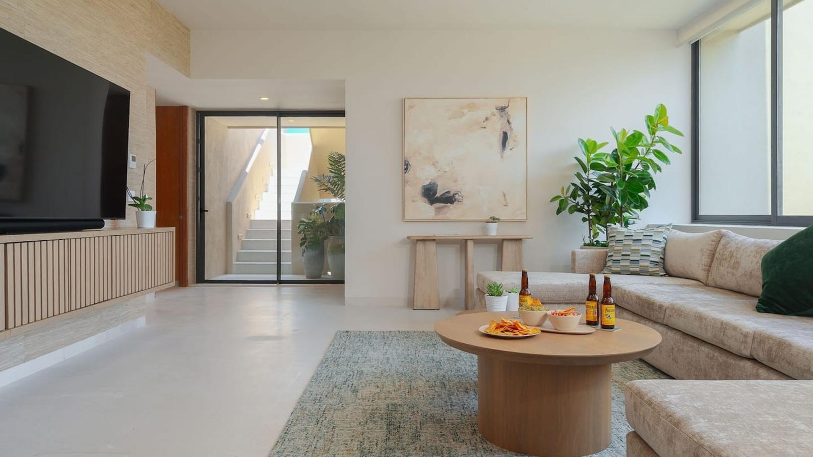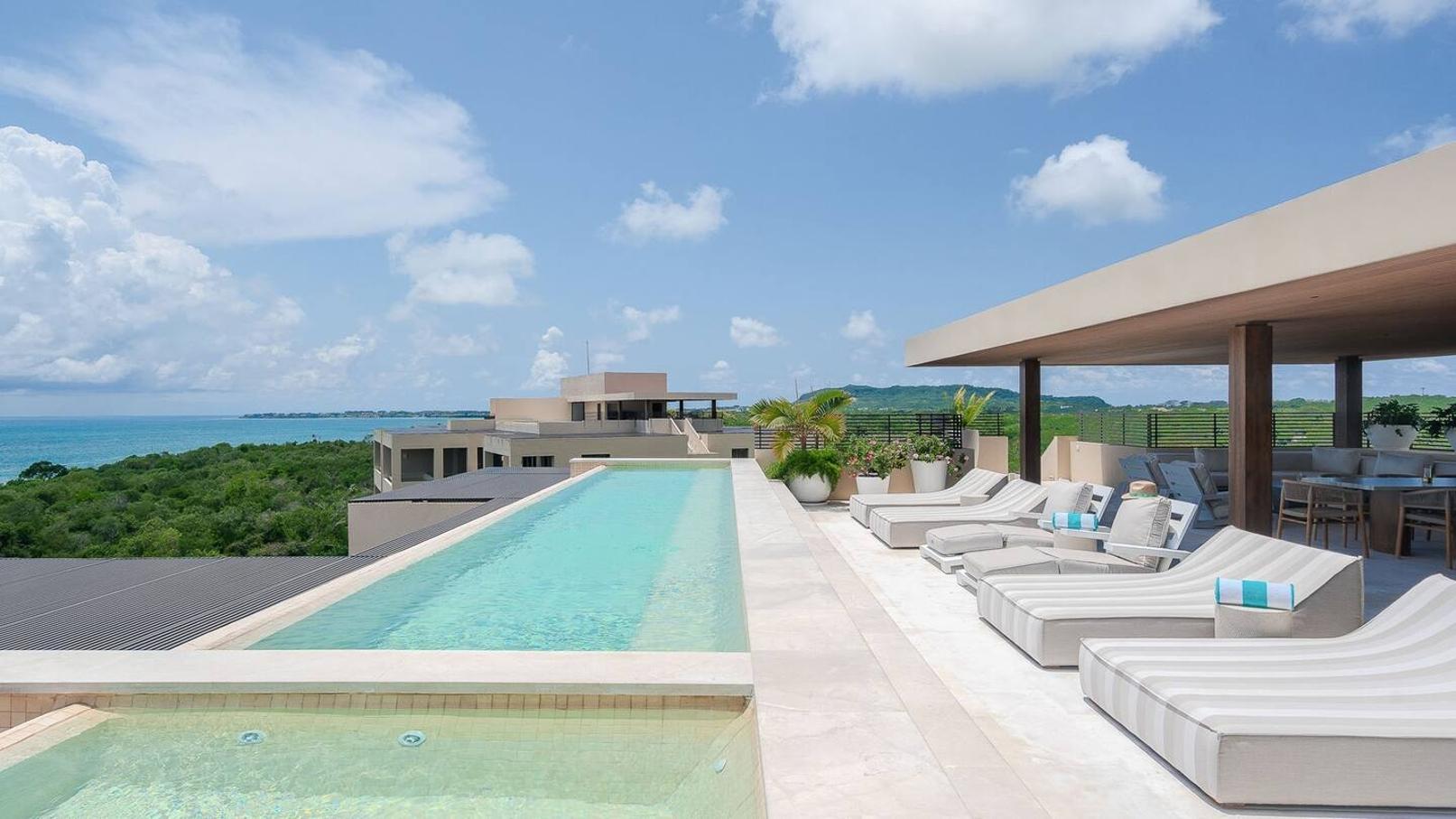 This penthouse unfolds across two vibrant levels designed for every mood. On the lower terrace, sun loungers frame a blissful private pool with ocean views. Indoors, a relaxed family room invites movie marathons, while the more refined lounge offers an elegant space for conversation and evening drinks. Upstairs, the rooftop terrace enchants guests with a dazzling lap pool, chic loungers, open-air lounge, dining space, and bar area. Whether it’s poolside indulgence, family downtime, or rooftop soirées under the stars, every corner sets the scene for unforgettable moments.