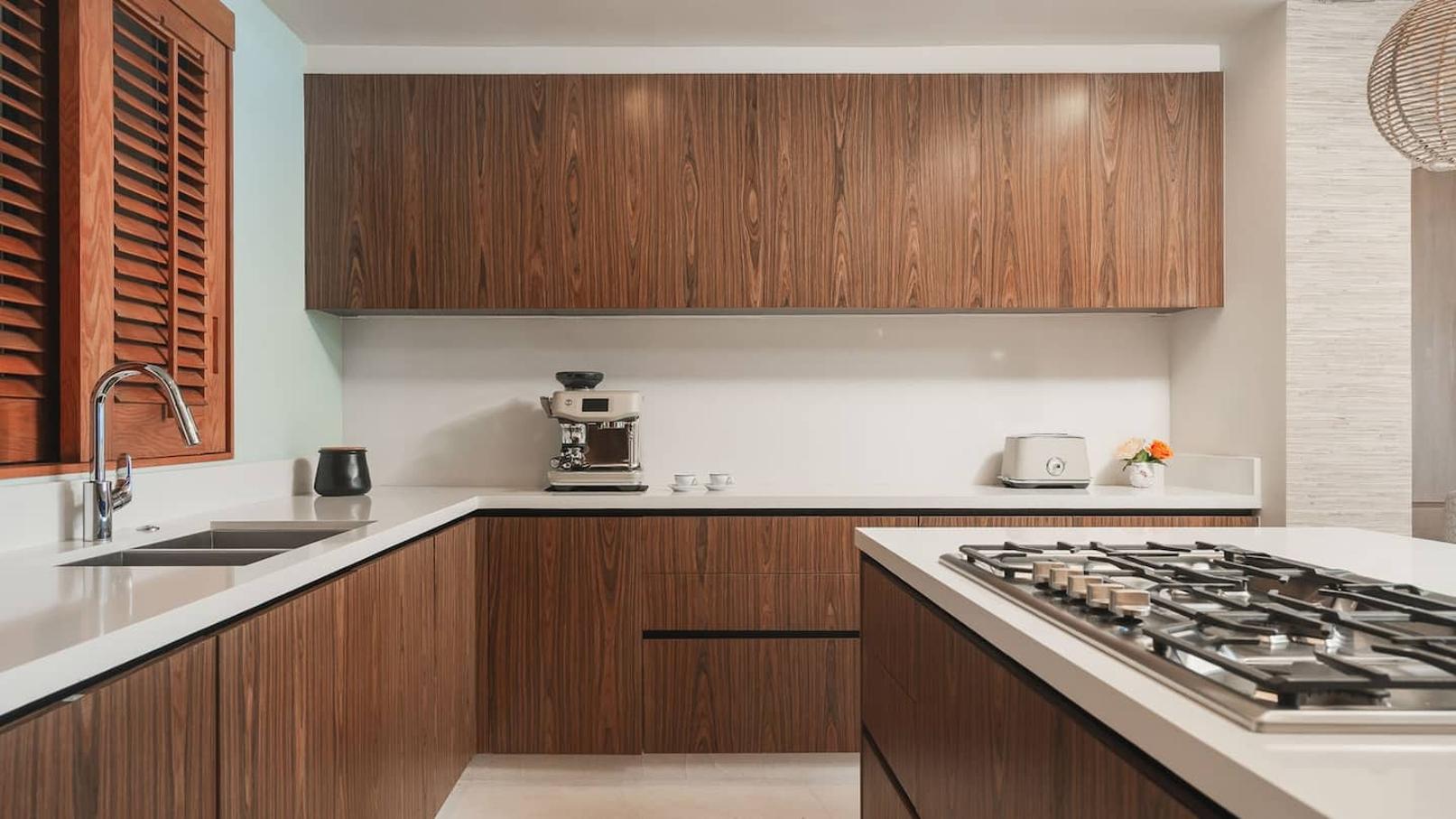 Four serene bedrooms, each with crisp linens, warm wood accents, and spa-style ensuite bathrooms. The look is contemporary beach chic, designed for restful nights and indulgent morning routines.