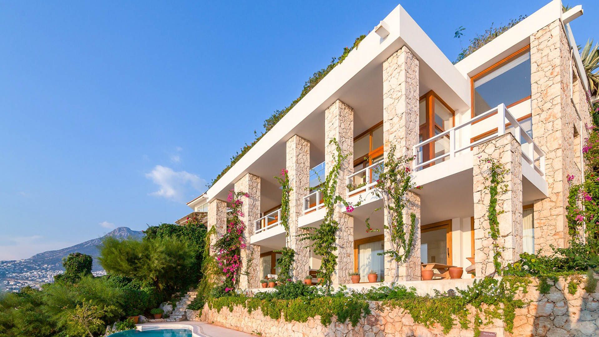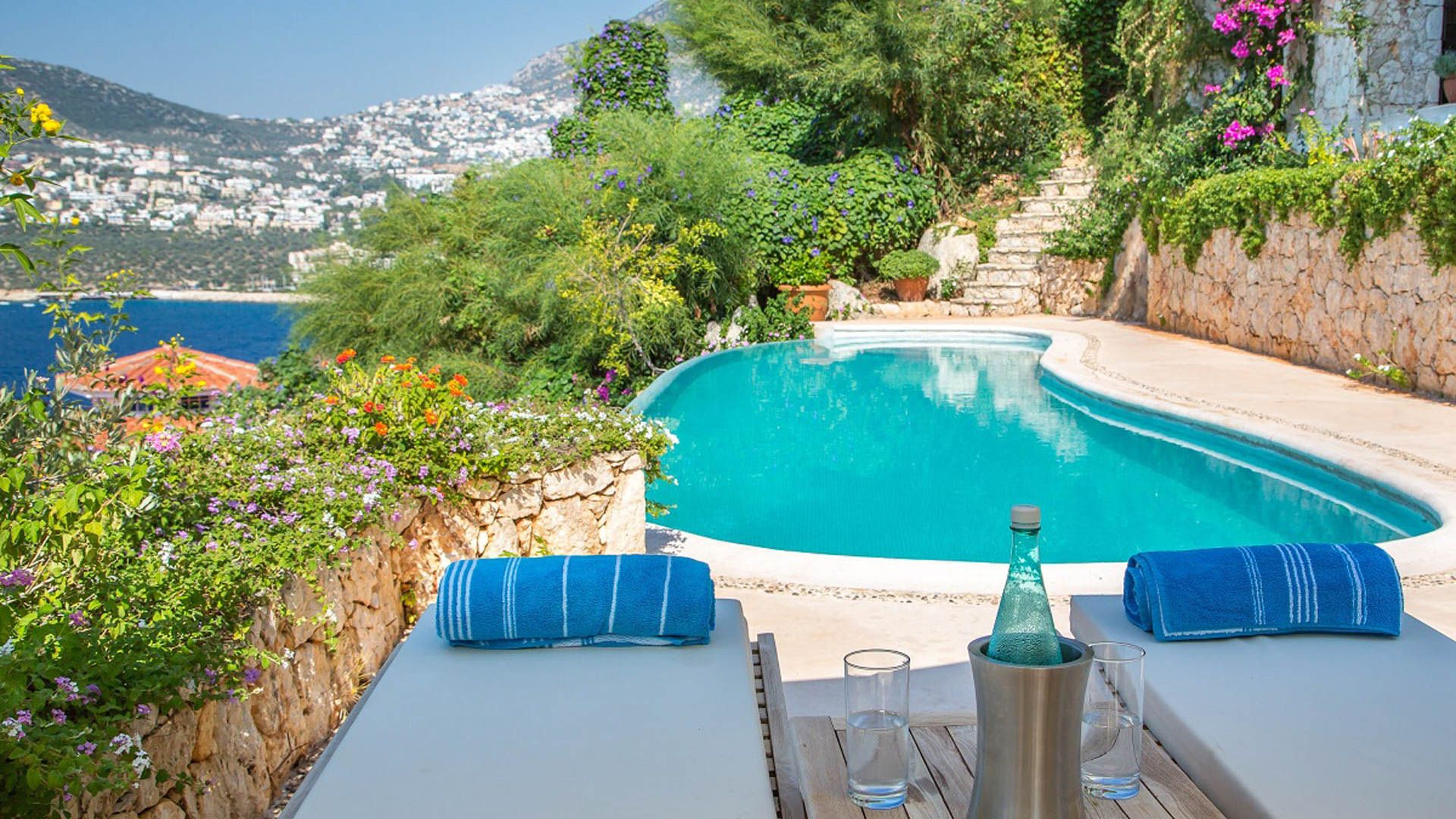 Hidden amongst shrubs, flowers and scented bushes, this Kalkan villa commands an idyllic setting. It perfectly combines magnificent sea views, the warmth of the local stone walls, a cute, kidney shaped pool, and well-tended gardens to create a charming façade that complements the more current interiors.
