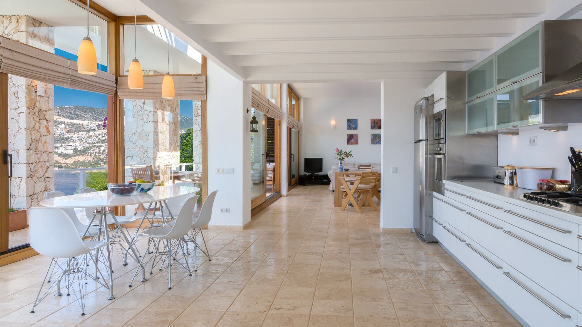 Soaring ceilings and an open plan living/dining and kitchen area make relaxing, eating and cooking a breeze. Coupled with easy access to the patios and terraces, this Kalkan rental home was made for al fresco living. And, with room service at the touch of a button, entertaining and dining under the stars has never been easier.