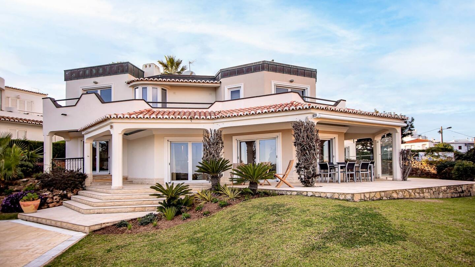 The open plan living and dining area of this luxurious Algarve villa is the perfect space for relaxation and entertainment.