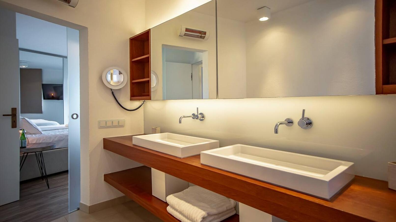 Sleeps 2 – King-size bed. En-suite bathroom with vanity and rain head and handheld shower. Access to pool patio.