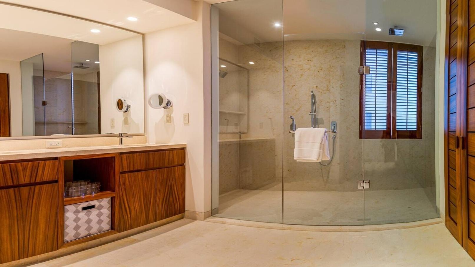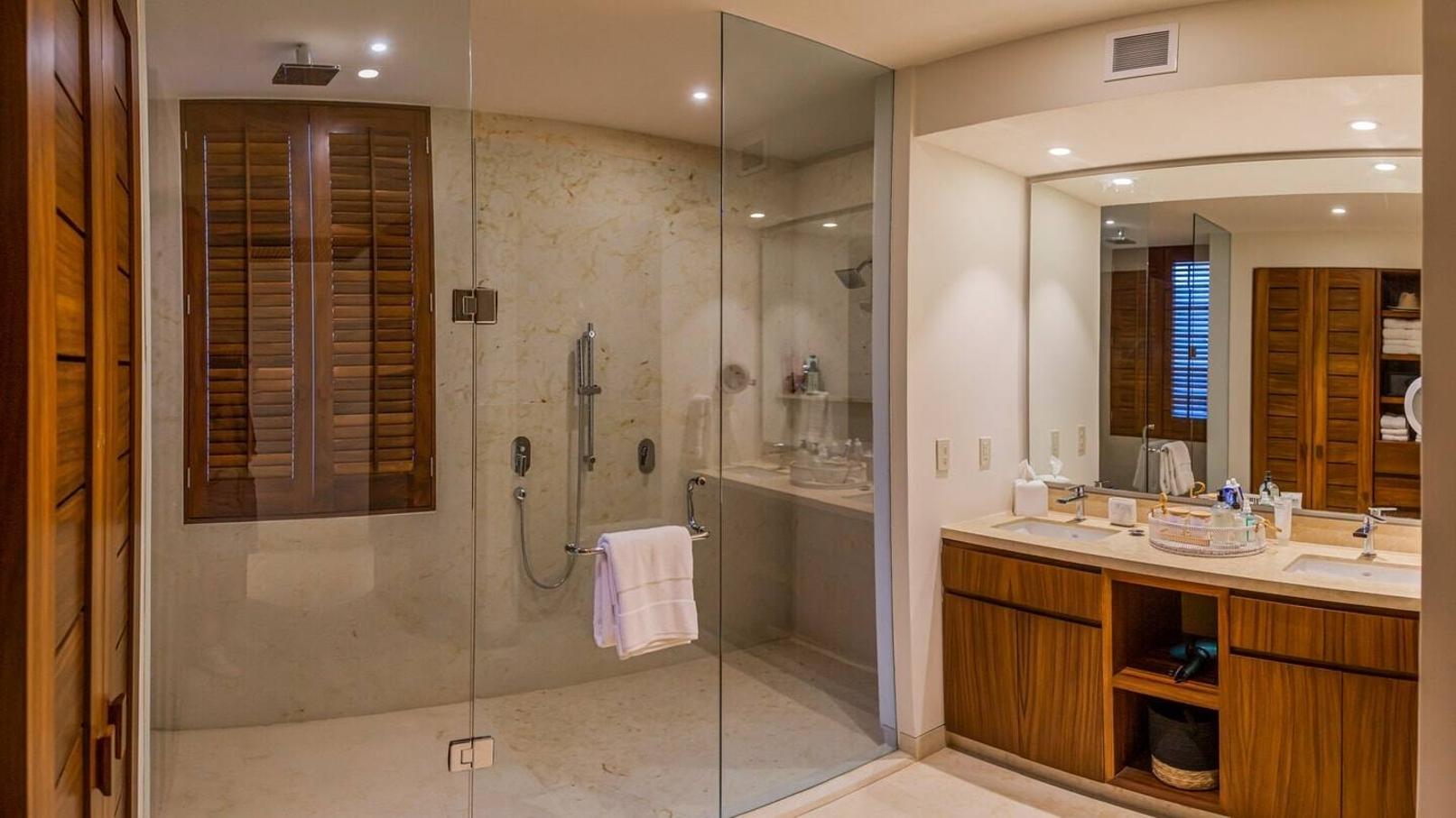 Marble bathrooms are spacious and sparkling.