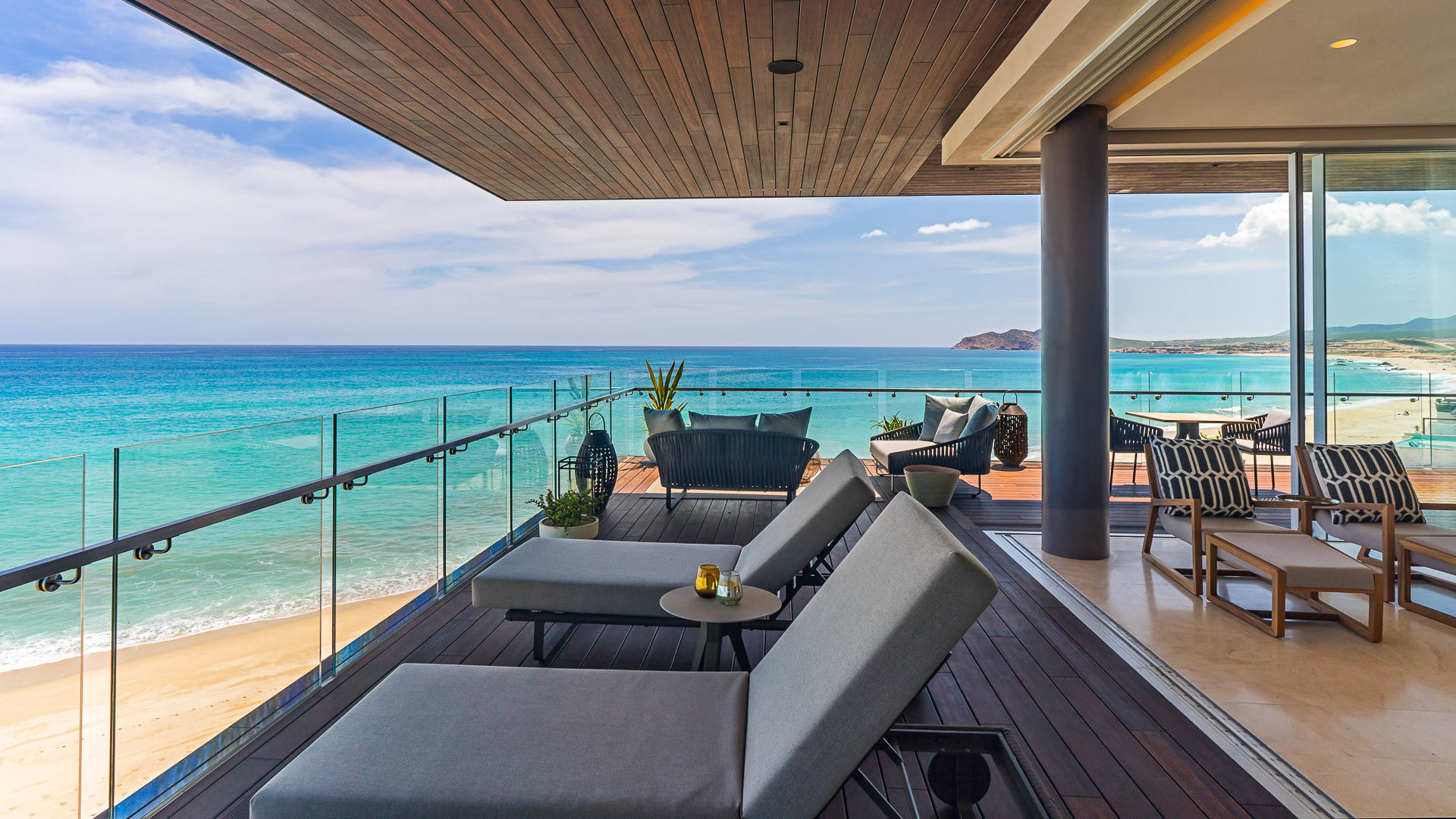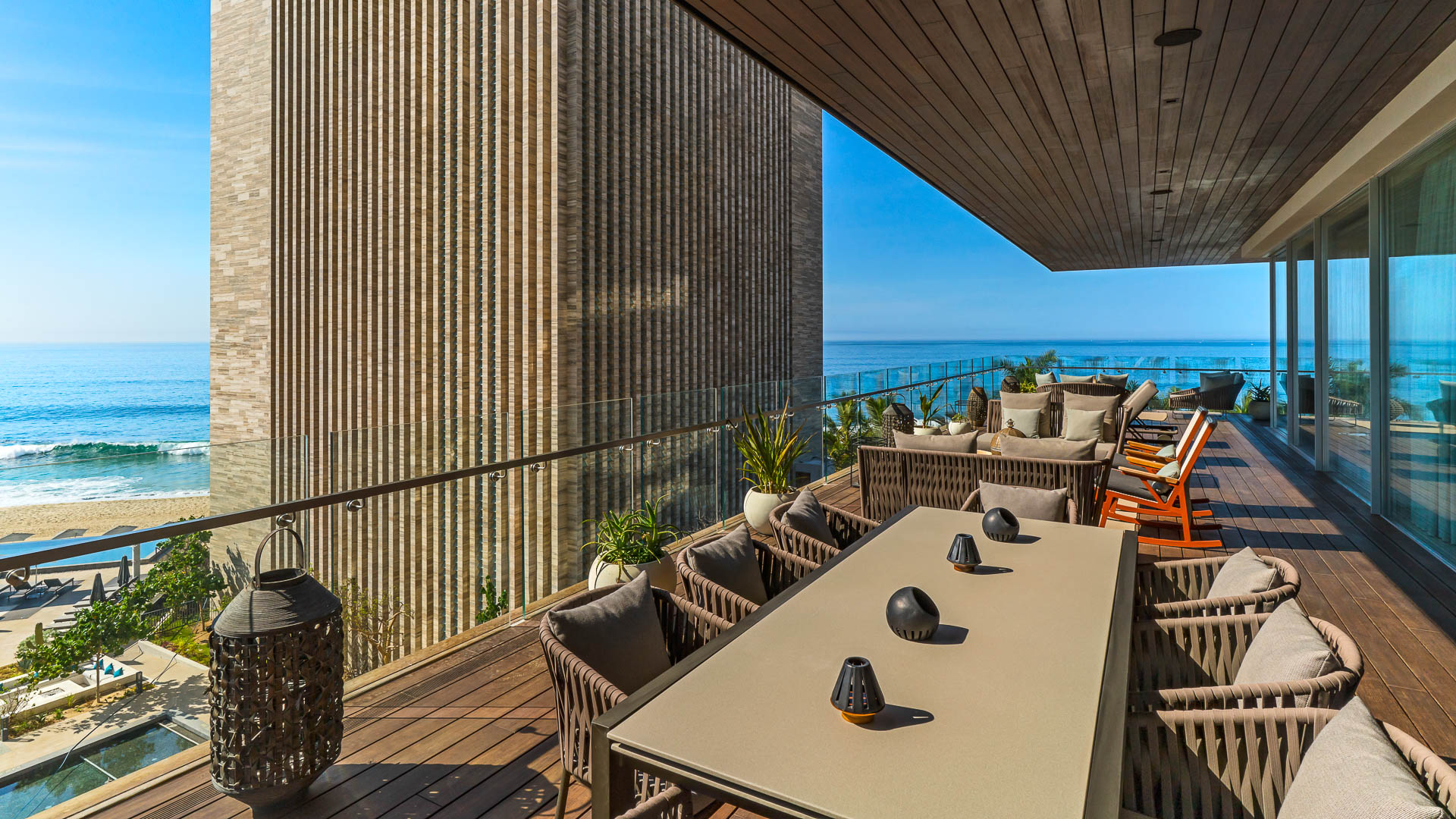The wrap around terrace is furnished with elegant outdoor seating, providing an impeccable setting for soaking up the sun, enjoying the sunset, or simply lounging in the gentle sea breeze.