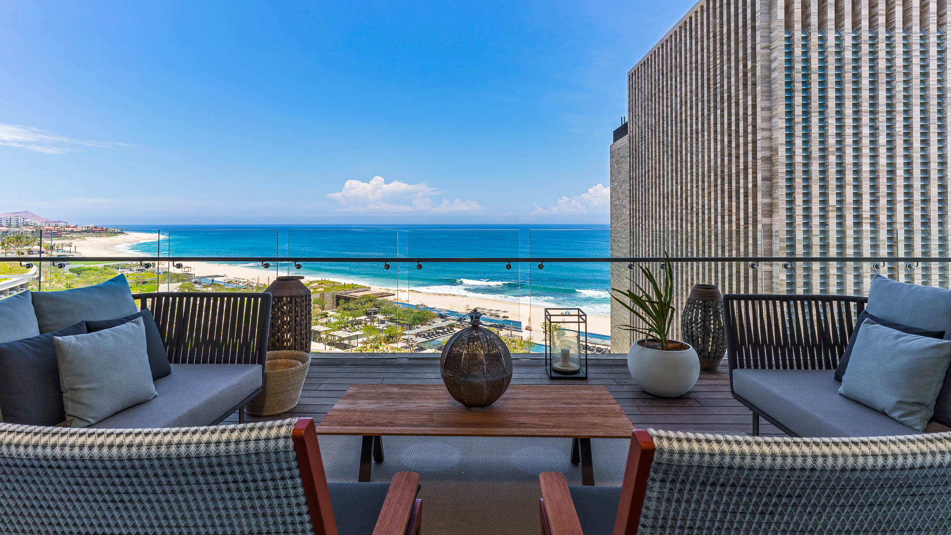 The condo’s open plan living area, bathed in natural light, opens to a wraparound terrace through retractable glass doors that blur the line between indoors and out. The interior is appointed with plush, comfortable seating that is arranged to set the ocean views at the very center of your experience.