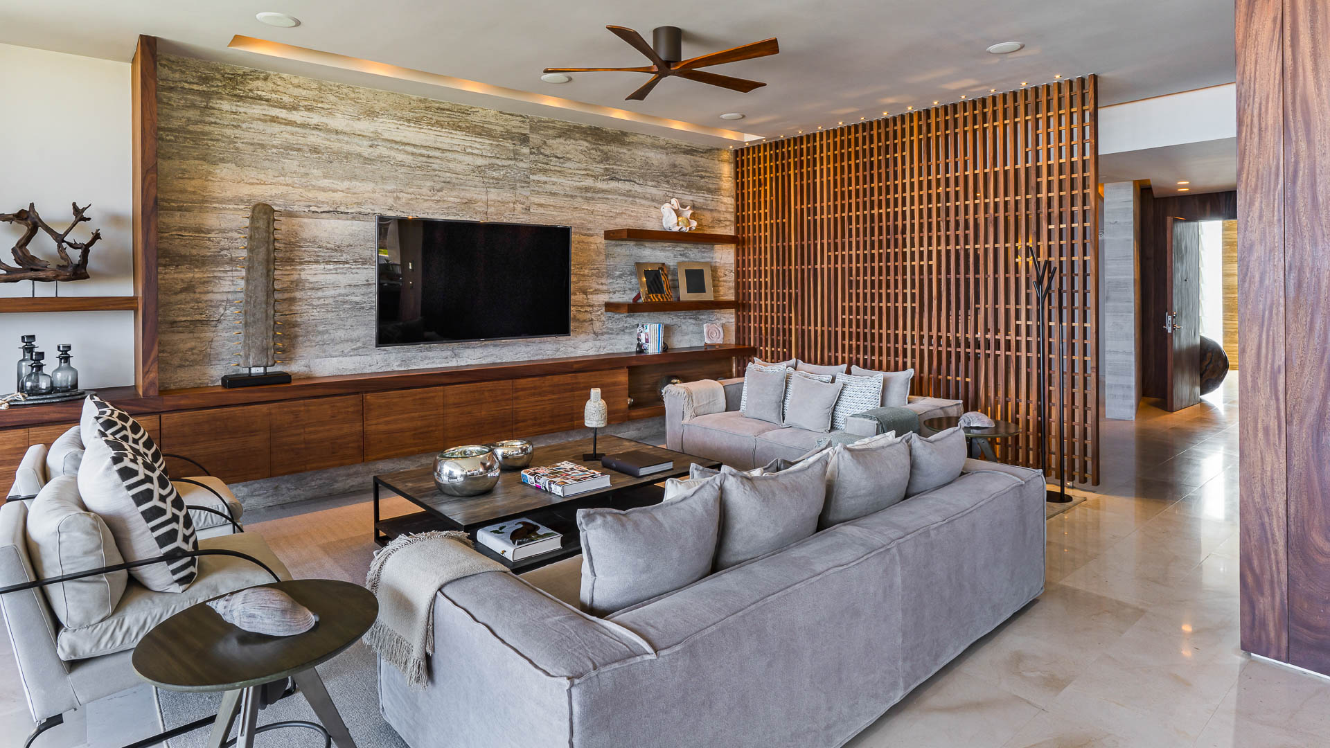 This Cabo residence features three elegantly appointed bedrooms—a principal bedroom with a king-sized bed and two guest bedrooms, each outfitted with a pair of queen-sized beds. Together with three well-appointed full bathrooms and a powder room, the space ensures privacy and ease for all guests.