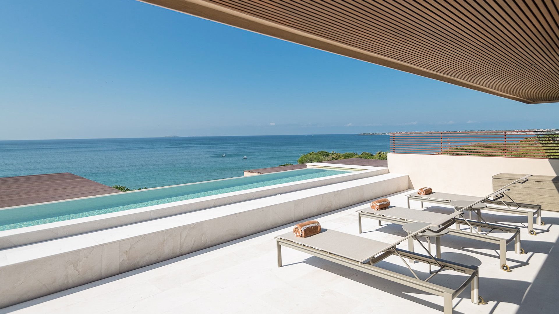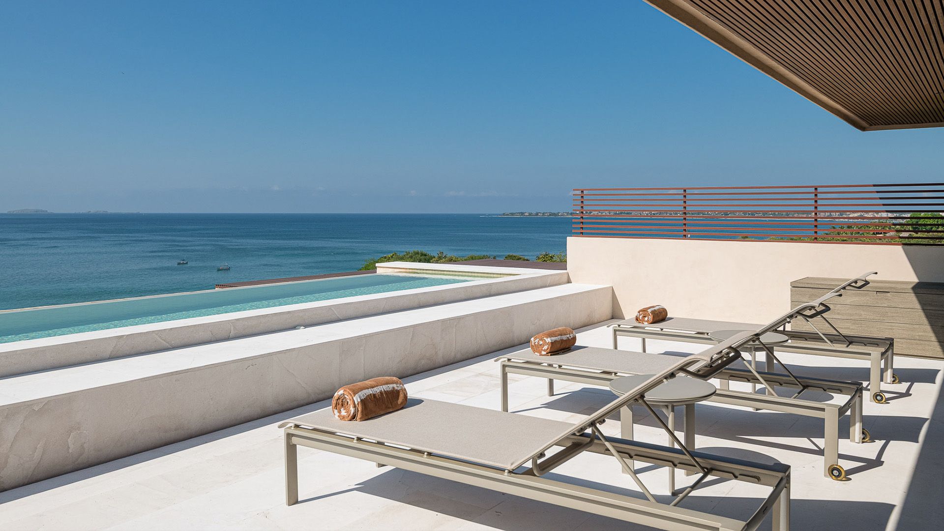 The rooftop terrace crowns the experience, featuring a lap pool, jacuzzi, open-air bar, and dining area framed by sweeping ocean views.
