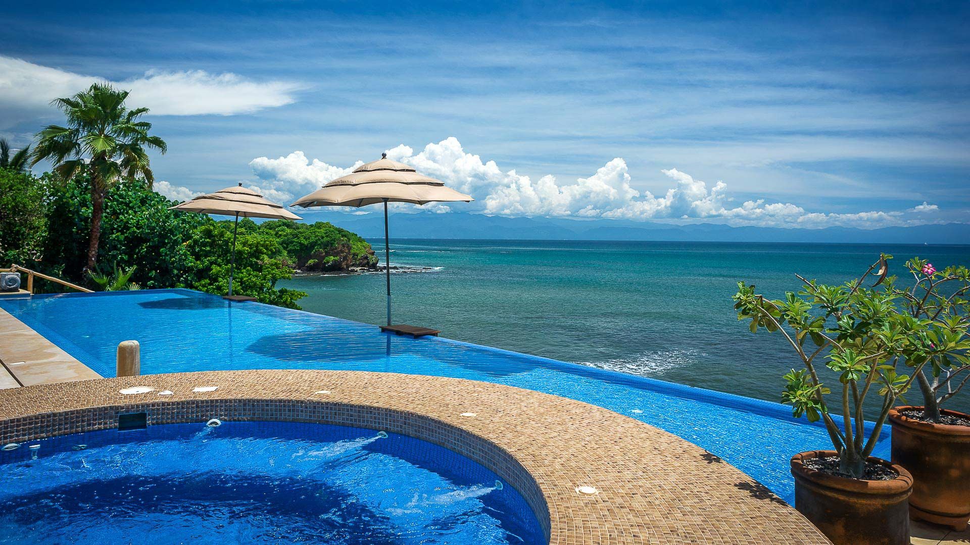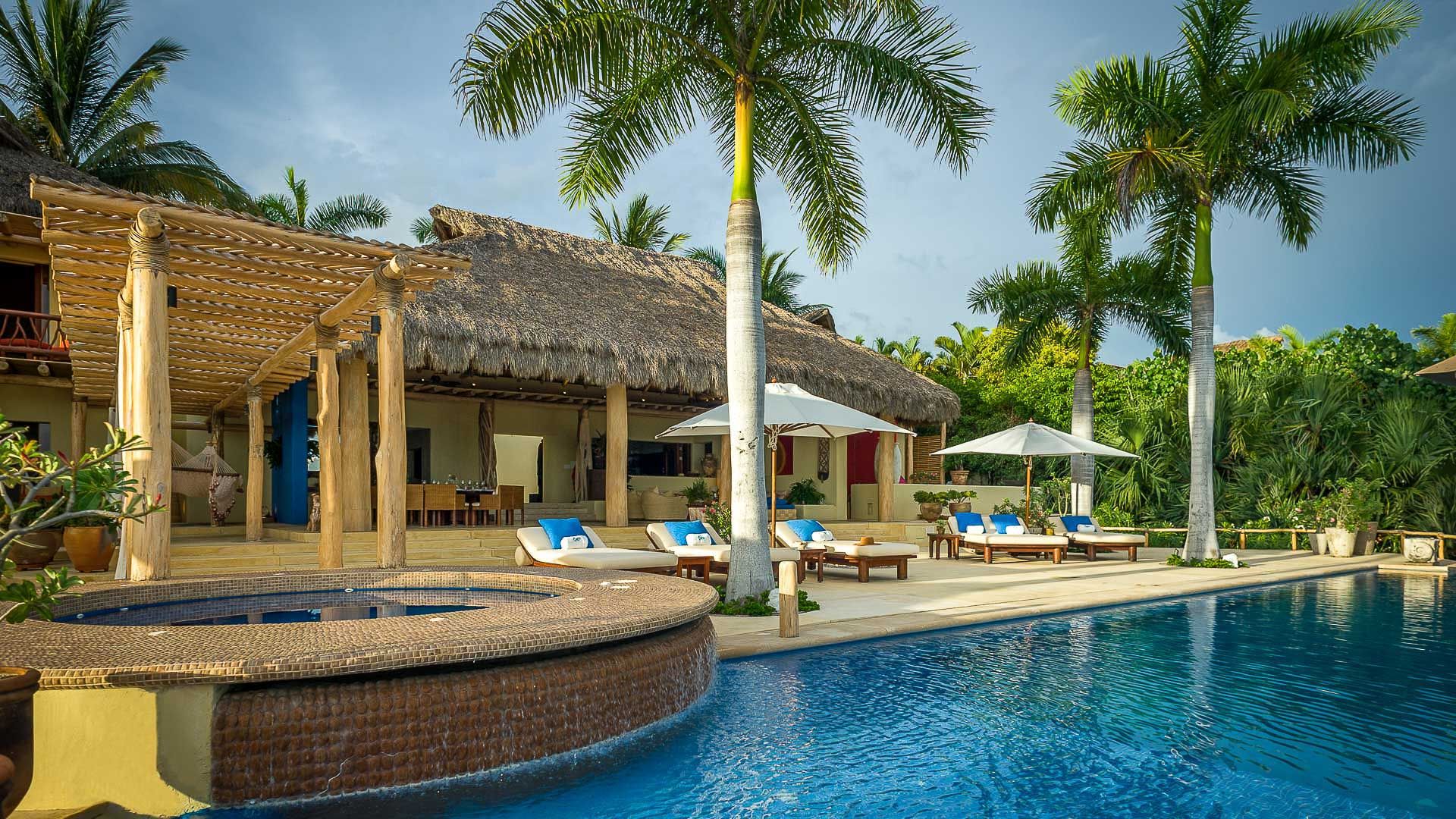 In true Mexican style, the impressive palapa living area is the focus for daily activity, such as dining and relaxing in the shade. This elegant space adapts itself to al fresco living during the day and glamorous gatherings at night. The palapa terrace flows naturally to the pool terrace where you will spend hours simply being awed by the view and listening to the waves lap below on your private beach.
