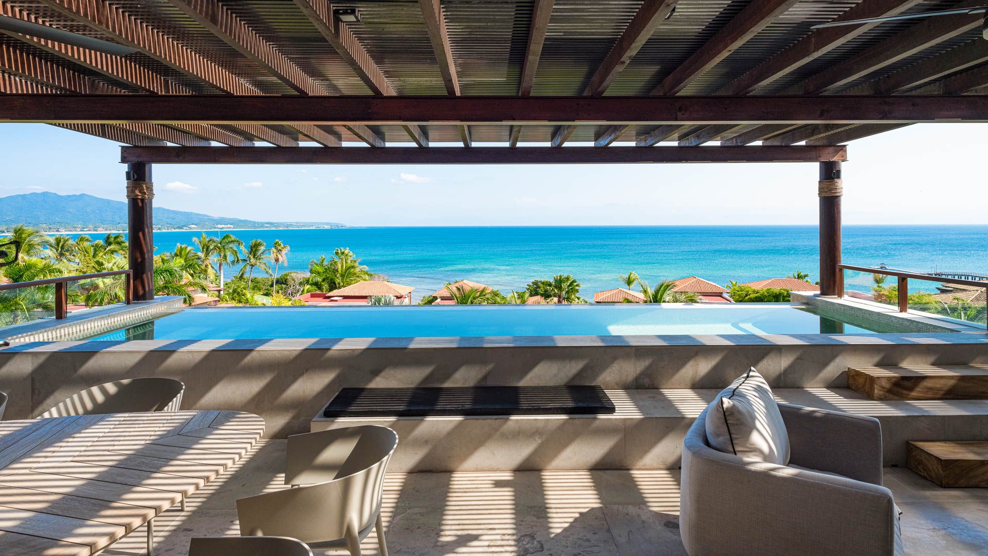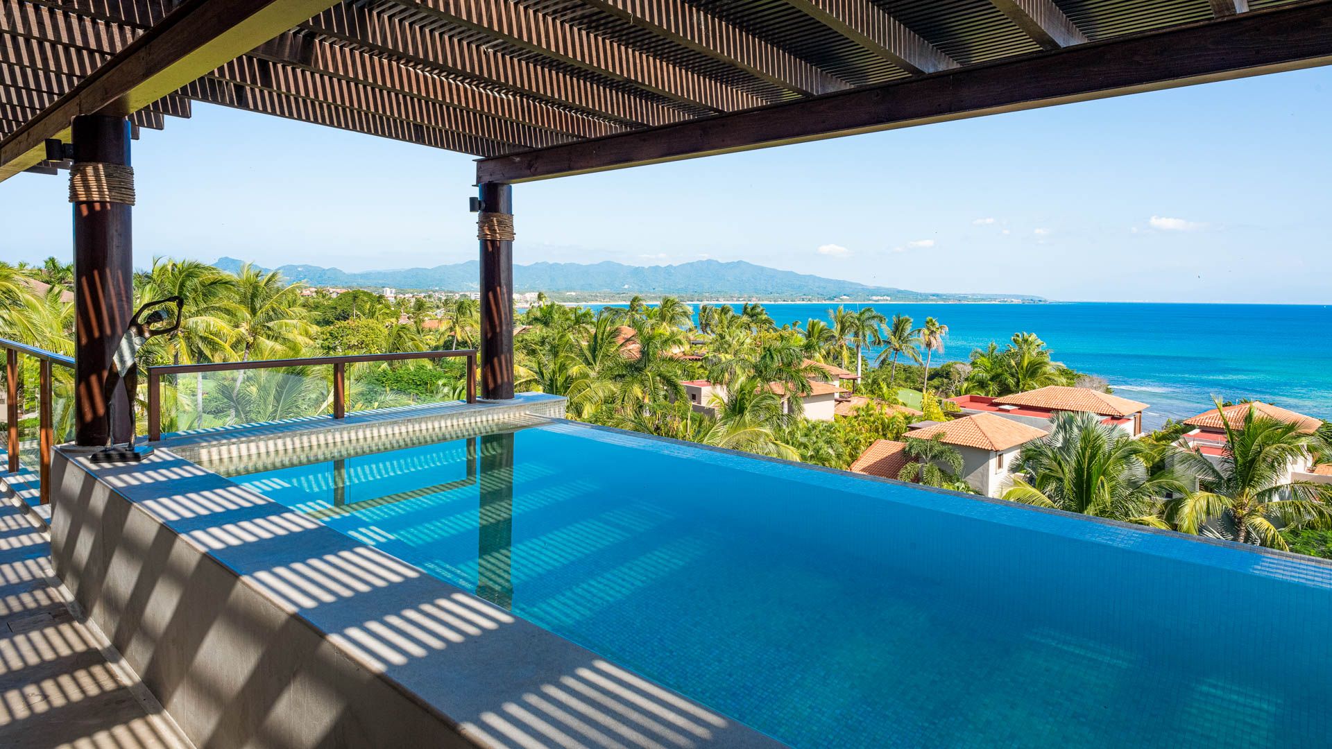 With 4 spacious bedrooms—2 with king-size beds and 2 with two queen-size beds each—this luxury condominium comfortably accommodates guests. The infinity pool offers an unbeatable view of Banderas Bay and the Marieta Islands, making every moment here unforgettable.