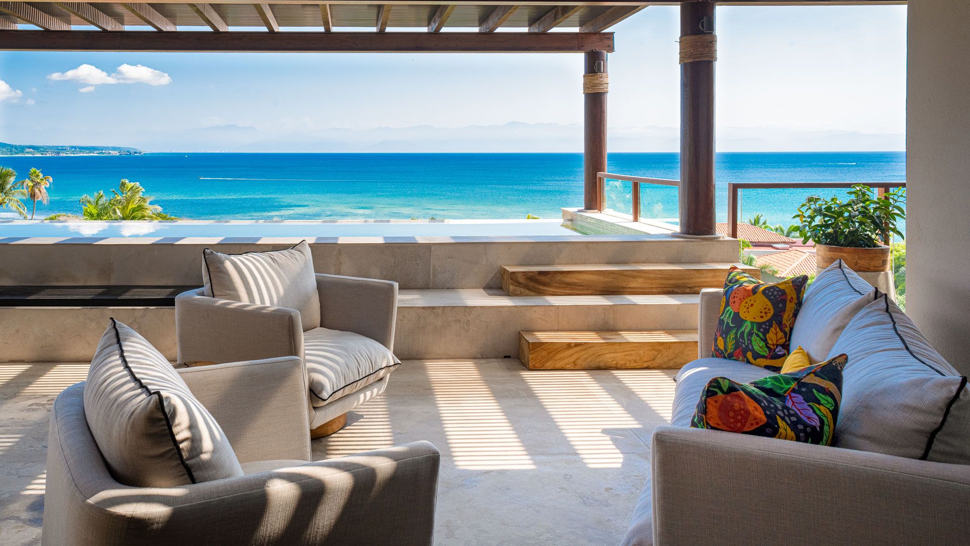 This is not just a rental—it is an extraordinary escape where every detail has been curated to ensure an unforgettable stay. Light-colored wood and marble throughout, complemented by vibrant color accents in the furniture and decorative items, enhance the luxury vacation experience.