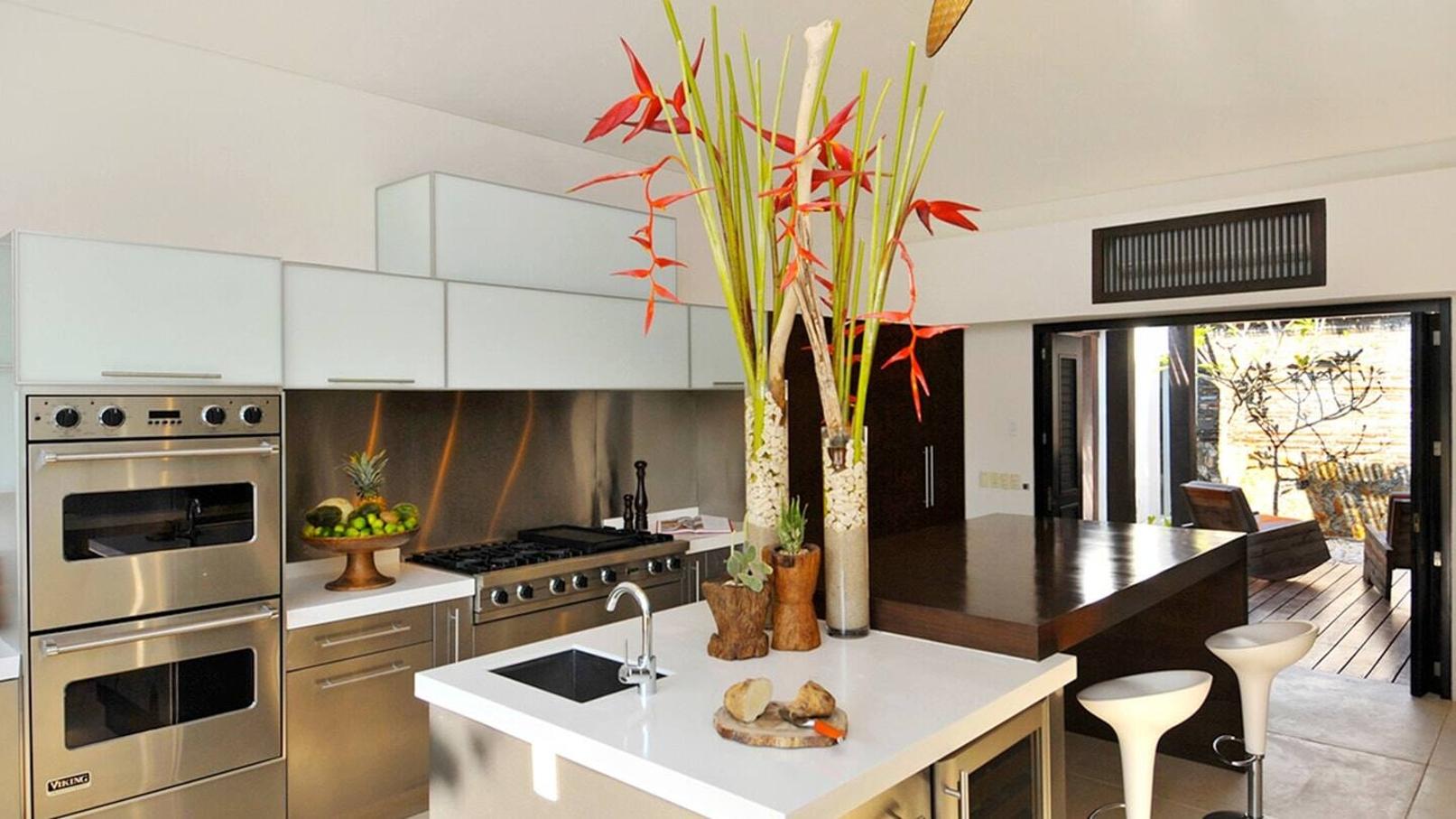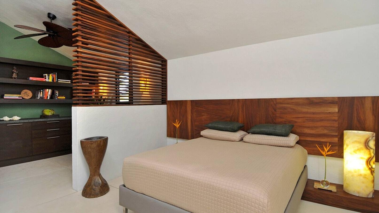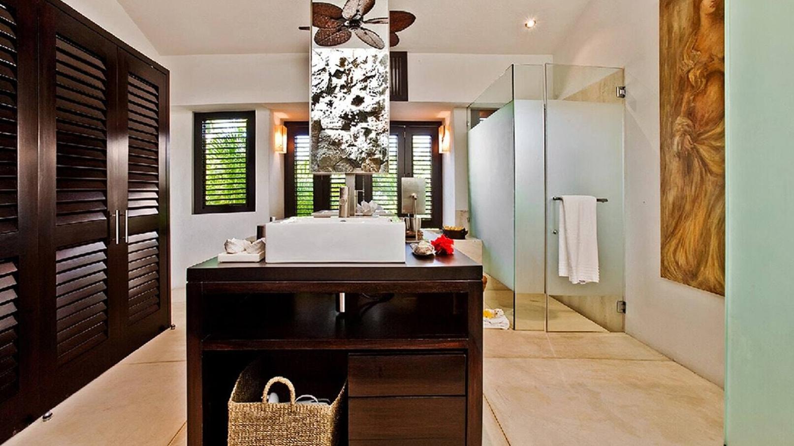 A feeling of tranquility envelops you as you quickly acclimate to the high standard of comfort and serenity where water features abound. Walls of shutters open to lily ponds, water features, hidden gardens and aquatic adornments. Five of the 6 bedrooms are located on the ground level – each filled with natural light and soft breezes. A large, upper-level studio room – equipped with a kitchenette, microwave and fridge – makes the perfect nanny/teenage casita.